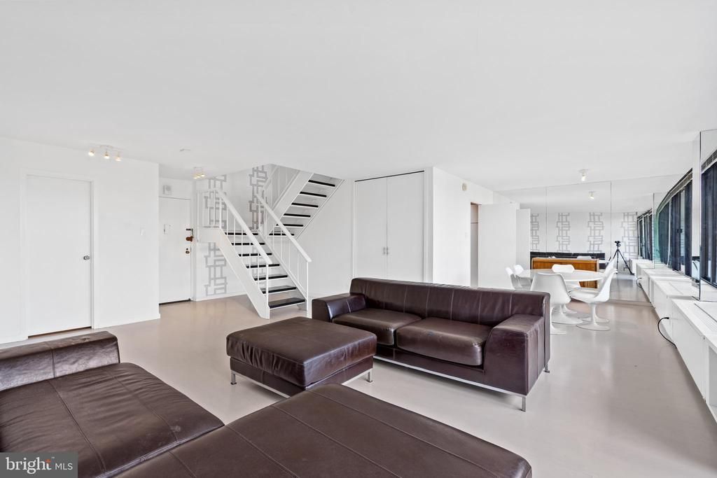 Modern and bright spacious duplex-style residence. 1525 sq ft of living space. 3 bedroom -Currently shown as a 2 BR + den. Large 29 foot wide balcony with built in planters. Light-filled panoramic cityscape view. Large living room and dining area. Windows and balcony across entire apartment. Washer dryer combination. Luxurious baths/Primary bedroom with spa soaking tub! Garage parking space. extra storage. LOW FEE -All inclusive Co- op fee includes property taxes, parking, utilities, basic cable, internet, and maintenance of HVAC. Watergate East amenities include 24 hour desk and doorman service, sparkling renovated lobby, roof deck , pool, fitness room, plus on-site shops and restaurants. High walk score Walking distance to the Trader Joes, Whole Foods , Kennedy Center, Georgetown Waterfront, bicycle paths, Foggy Bottom Metro, Watergate Hotel & Spa, GWU, restaurants, and more!