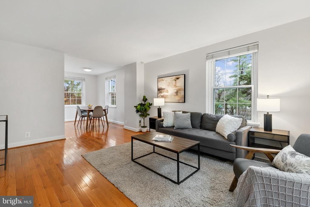 Gorgeous 2-bedroom, 2-bathroom Clarendon I model end-unit townhome nestled in Fairlington Villages! A convenient coat closet welcomes you at the entry, along with gleaming hardwood floors that extend throughout the main & upper levels. The spacious, freshly painted, living room flows effortlessly into a separate dining area with overhead lighting. The kitchen features updated cabinetry with modern pulls, quartz countertops, a tile backsplash, & stainless steel stove, microwave, & dishwasher. Just off the kitchen, step outside to the private fenced patio - perfect for relaxing, grilling, or enjoying time outdoors. Upstairs, the freshly painted hallway offers overhead lighting and a linen closet for added storage. The beautifully updated bathroom features an oversized quartz-topped vanity & a sparkling white subway-tiled shower with soaking tub & niche shelving. The spacious primary bedroom includes a ceiling fan with overhead lighting & a wall-to-wall walk-in closet. The second bedroom is filled with natural light from windows on two walls and includes a closet with shelving for excellent organization. The renovated lower level boasts tall ceilings, recessed lighting, & wood-look tile flooring throughout the large recreation room & bonus room. The rec room features wall-to-wall custom built-in cabinetry with a charming soft-close bench seat with storage, along with full-size daylight windows with plantation shutters that allow natural light to fill the space. Additional highlights include under-stair storage with a newer water heater (2023), a versatile bonus room - perfect for guests or a home office - and a full bathroom with pedestal sink, corner shower with sparkling white subway tile & niche shelving. A laundry nook with a full-size washer & dryer and overhead shelving adds convenience to this level. This home comes with 2 reserved/unassigned parking spaces. Fairlington Villages residents enjoy six pools, lighted tennis courts, tot lots/playgrounds, walking paths, and MORE! Ideally located near I-395 and the shops & restaurants at The Village at Shirlington, West Alex, Baileys Crossroads, Del Ray, & Old Town.
